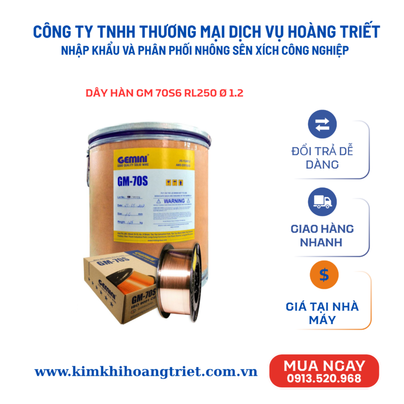 - GM – 70S là loại dây hàn có hàm lượng Carbon thấp, hàm lượng Mangan và Silic cao, tạp chất Lưu huỳnh, Phốt-pho vô cùng nhỏ tạo ra mối hàn có độ bền và độ dẻo dai cao.