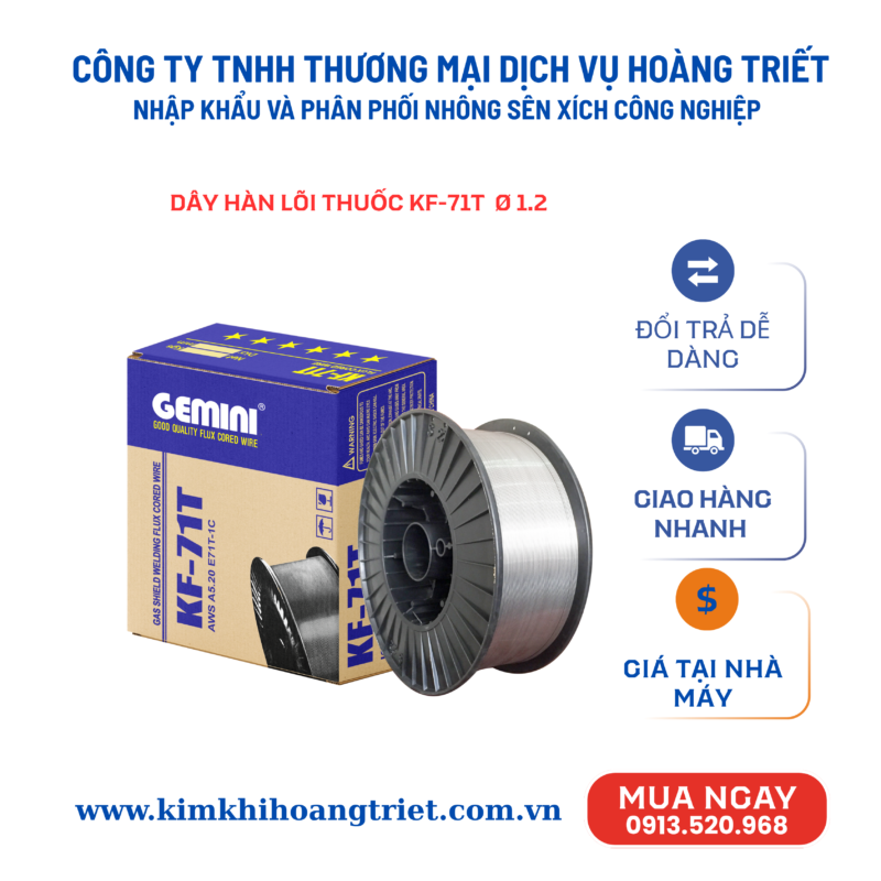 - Dây hàn lõi thuốc Gemini KF – 71T có hàm lượng Carbon thấp, hàm lượng Mangan và Silic trung bình, tạp chất Lưu huỳnh và Photpho vô cùng nhỏ tạo ra mối hàn có độ bền và độ dẻo dai cao.
