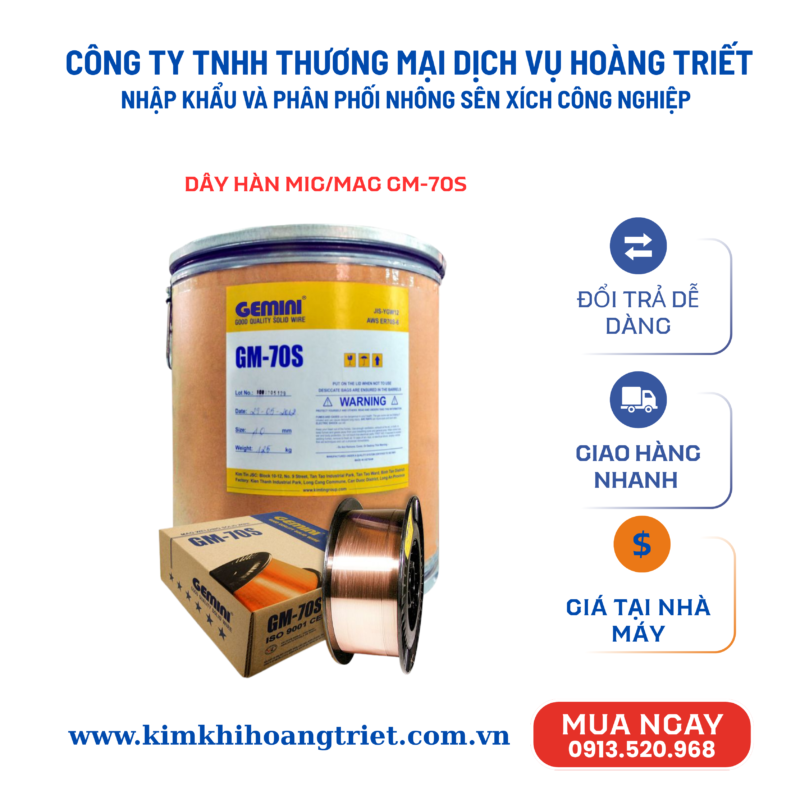 • GM – 70S là loại dây hàn có hàm lượng Carbon thấp, hàm lượng Mangan và Silic cao, tạp chất Lưu huỳnh, Phốt-pho vô cùng nhỏ tạo ra mối hàn có độ bền và độ dẻo dai cao.