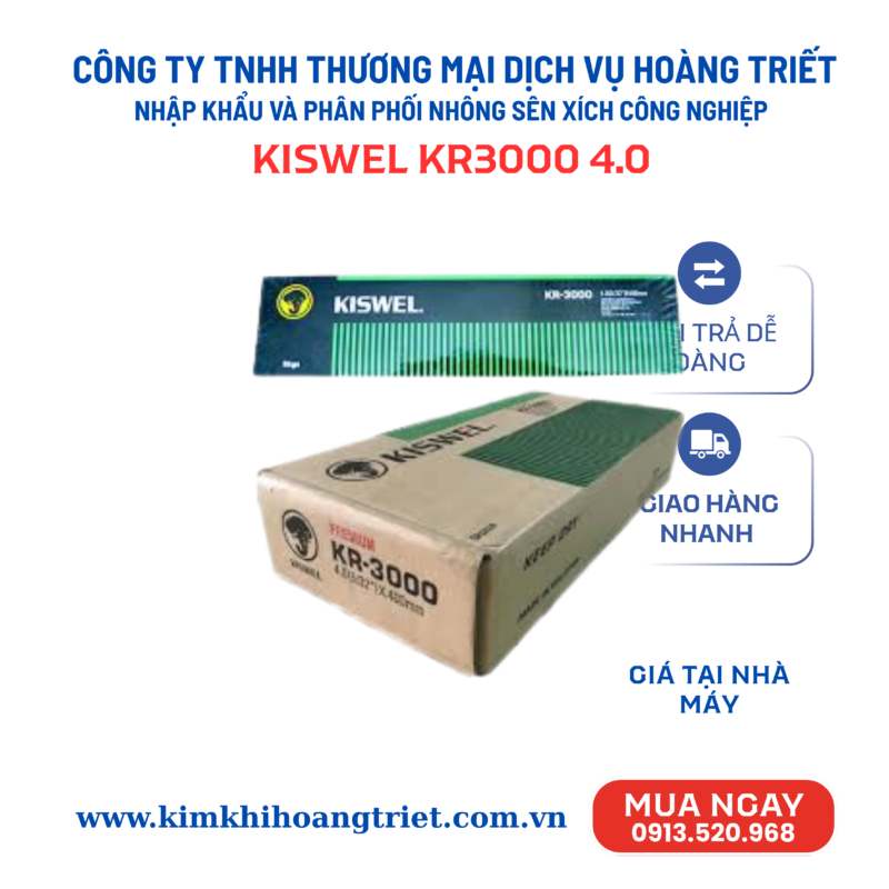 Với sự kết hợp hoàn hảo giữa chất lượng, giá cả và dịch vụ, Que hàn Kiswel KR-3000 4.0mm từ Hoàng Triết chính là giải pháp tối ưu cho mọi công trình hàn. Hãy để chúng tôi đồng hành cùng bạn trên con đường chinh phục những đỉnh cao mới!