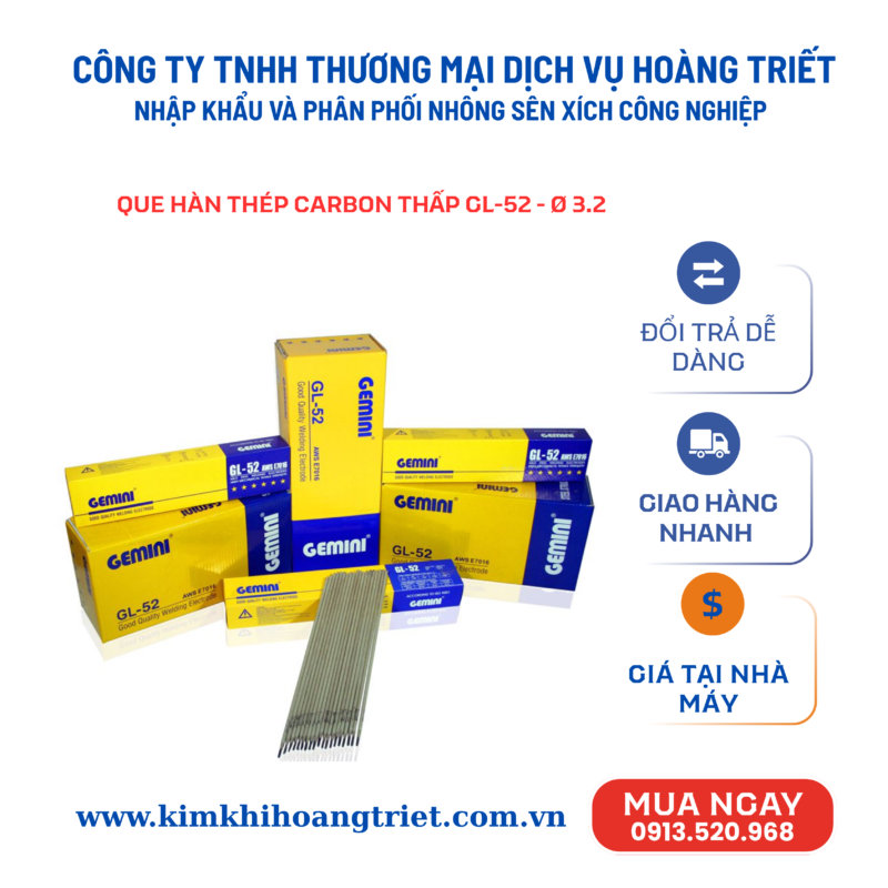 Nhà Phân Phối Hoàng Triết tự hào là địa chỉ tin cậy cho các sản phẩm que hàn thép carbon thấp GL-52 – Ø 3.2. Chúng tôi cam kết mang đến cho khách hàng những sản phẩm chất lượng cao, phù hợp với nhu cầu sử dụng trong các ngành công nghiệp và xây dựng.